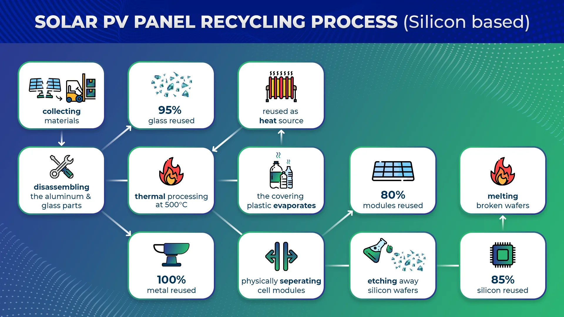 - Etching away the silicon wafer and smelting into reusable slabs, which is 85% reusable