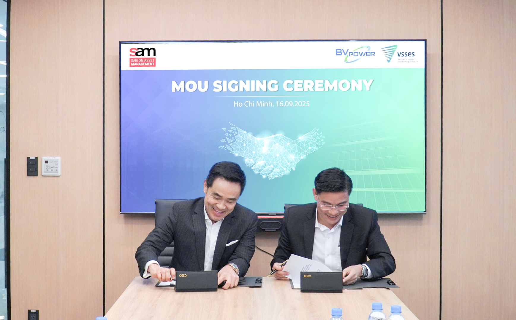 The moment of signing the cooperation agreement between SAM and BV Power — Mr. Louis Nguyen, Chief Executive Officer of SAM (on the left), and Mr. Pham Van Thuy, Chief Executive Officer of VSSES (on the right).